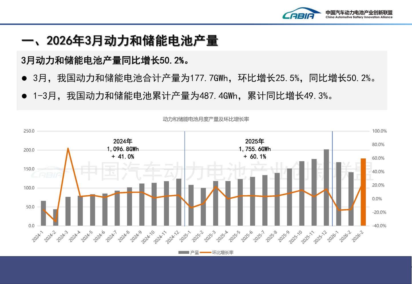 IT之家 4 月 10 日消息,根据中国汽车动力电池产业创新联盟发布的最新数据,2026 年 3 月,我国动力和储能电池合计产量为 177.7GWh,较 2 月环比增长 25.5%,同比增长 50.2%。今年 1 至 3 月,累计产量达到 487.4GWh,累计同比增长 49.3%。