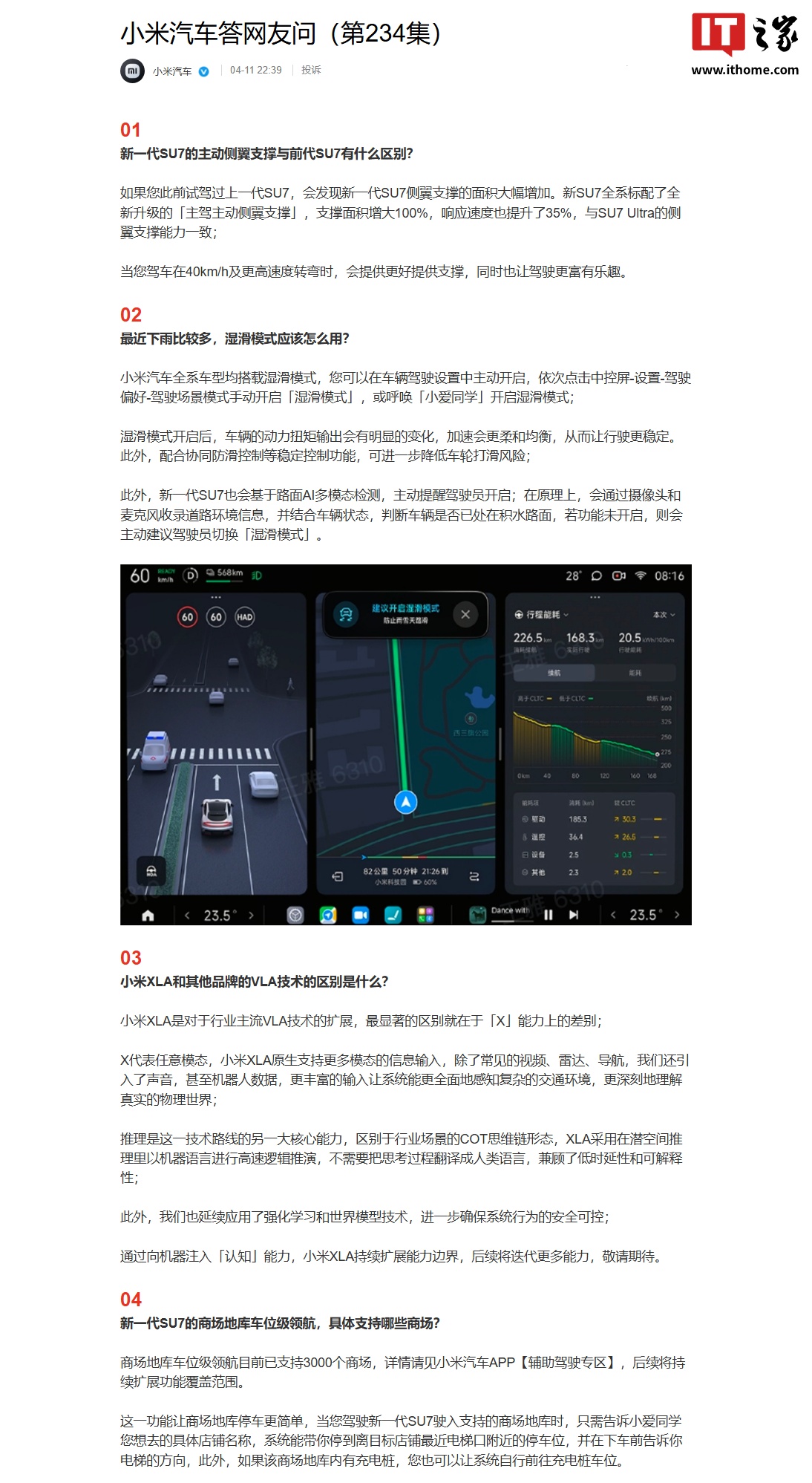 IT之家 4 月 12 日消息,小米汽车官方昨日发布答网友问(第 234 集),针对新一代 SU7 的主动侧翼支撑与前代 SU7 有什么区别、小米 XLA 和其他品牌的 VLA 技术的区别是什么等问题进行了解答。