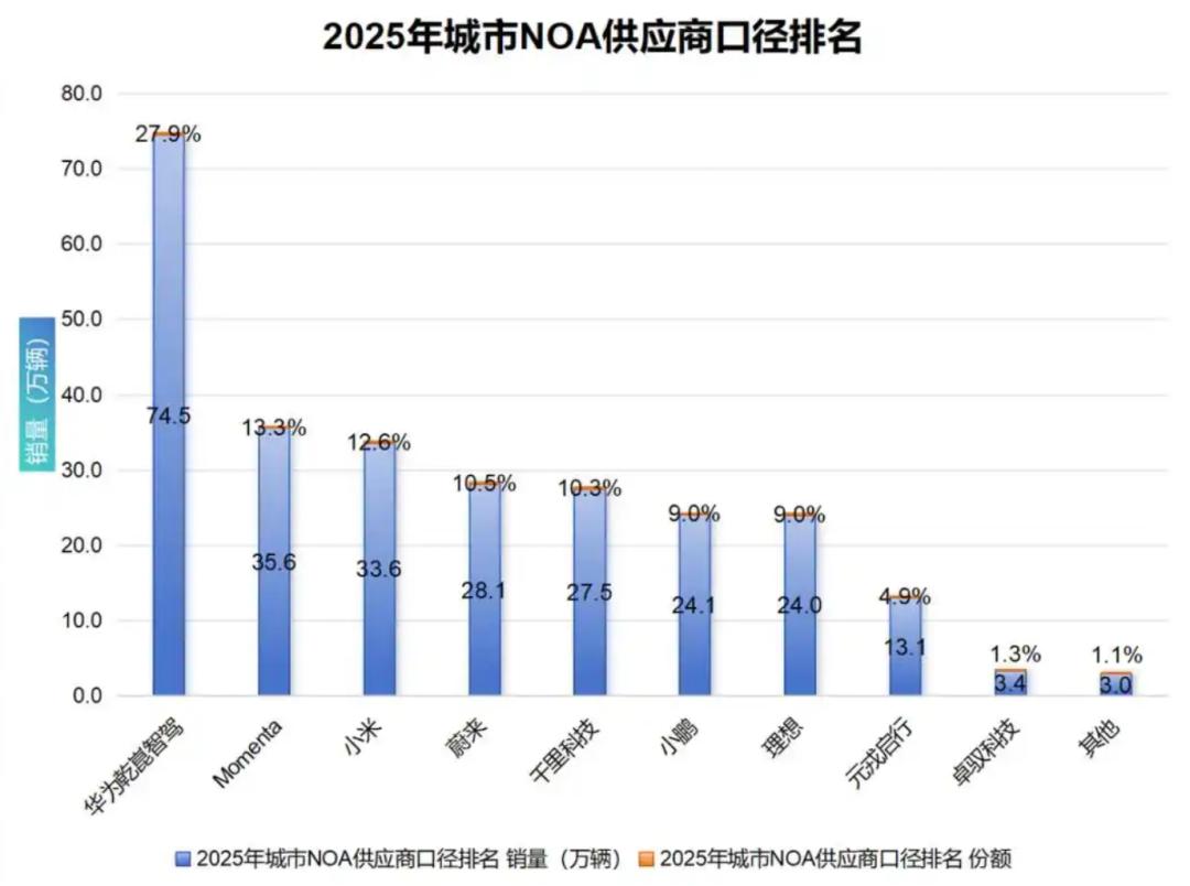 华为系是当前智驾领域的领跑者。2025年全年,华为乾崑智驾ADS以74.5万辆的城区NOA搭载量,继续蝉联市场冠军,占据约28%的份额。