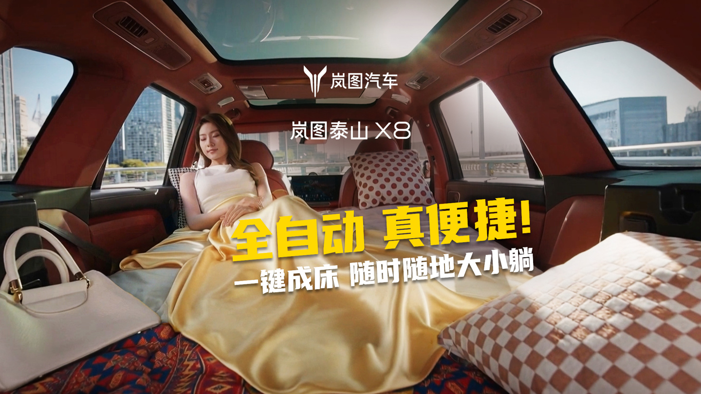 岚图泰山 X8 还会首发下沉折叠式座椅自动“隐身”,同时智眠床垫会自动充气展开,无需人工,一键成床,宣称 1 分钟变 2.1 米大床。