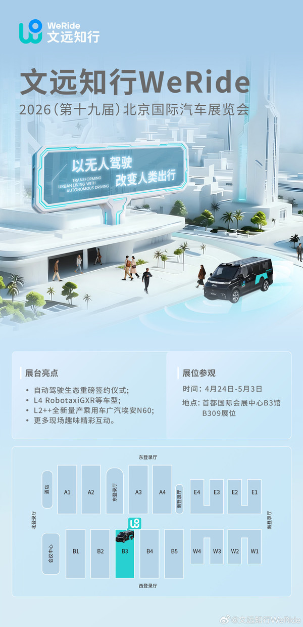 【CNMO科技消息】4月15日,全球自动驾驶科技公司文远知行正式宣布,将于4月24日至5月3日在首都国际会展中心B3馆B309展位亮相2026北京国际汽车展览会。本次参展,文远知行以“L2++和L4重磅同台”为核心亮点,带来从一段式端到端ADAS到纯无人Robotaxi的全栈式自动驾驶解决方案,全面展示其在辅助驾驶与无人驾驶两大技术赛道的商业化落地成果。
