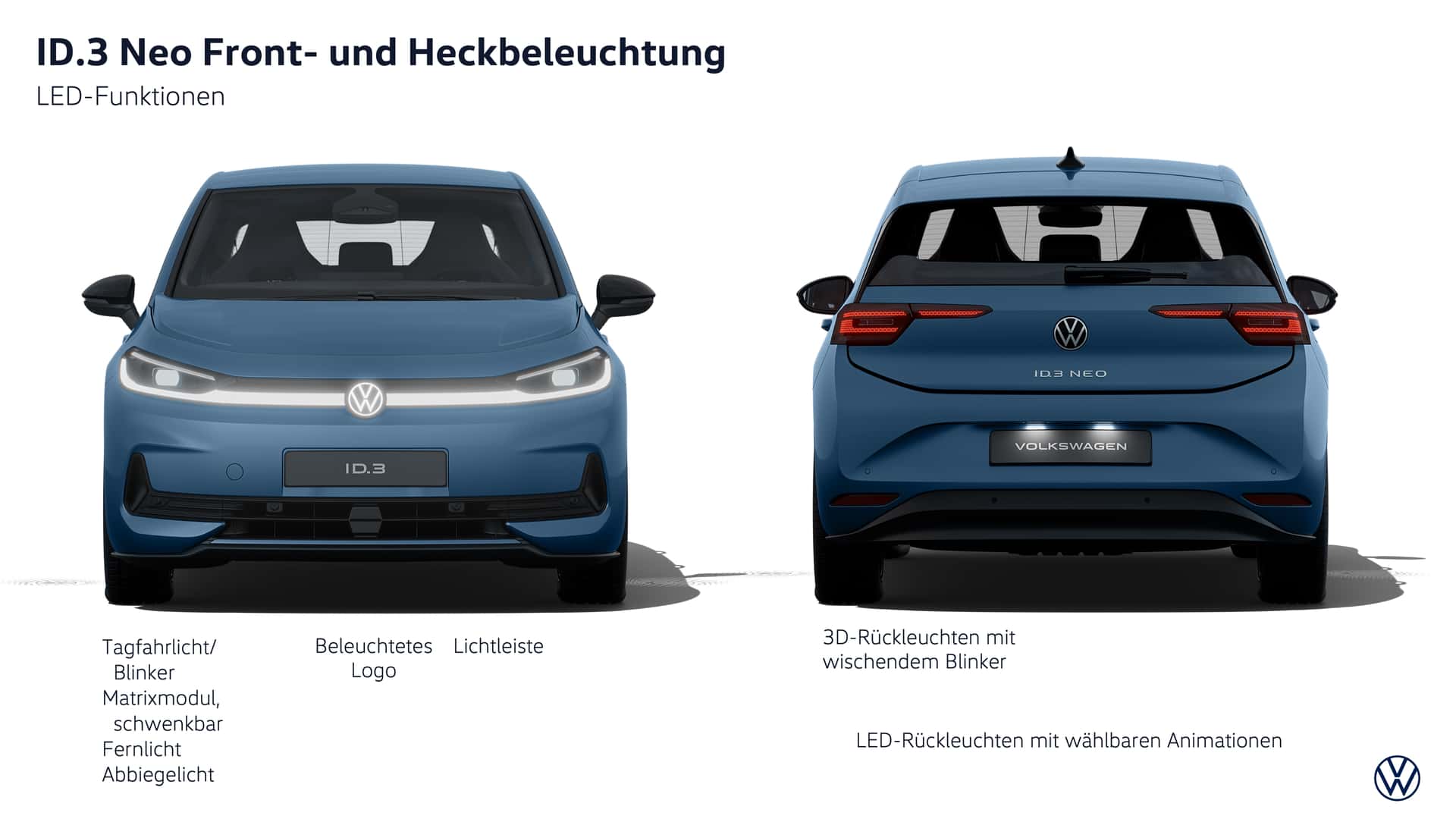 从外观来看,这是一次中期改款而非真正意义上的换代。ID.3 Neo 换装了经过重新设计的大灯,前保险杠也经过重塑。两侧大灯由一条发光的宽幅玻璃饰条连接,大众徽标同样可以点亮,灯条比以往更粗。
