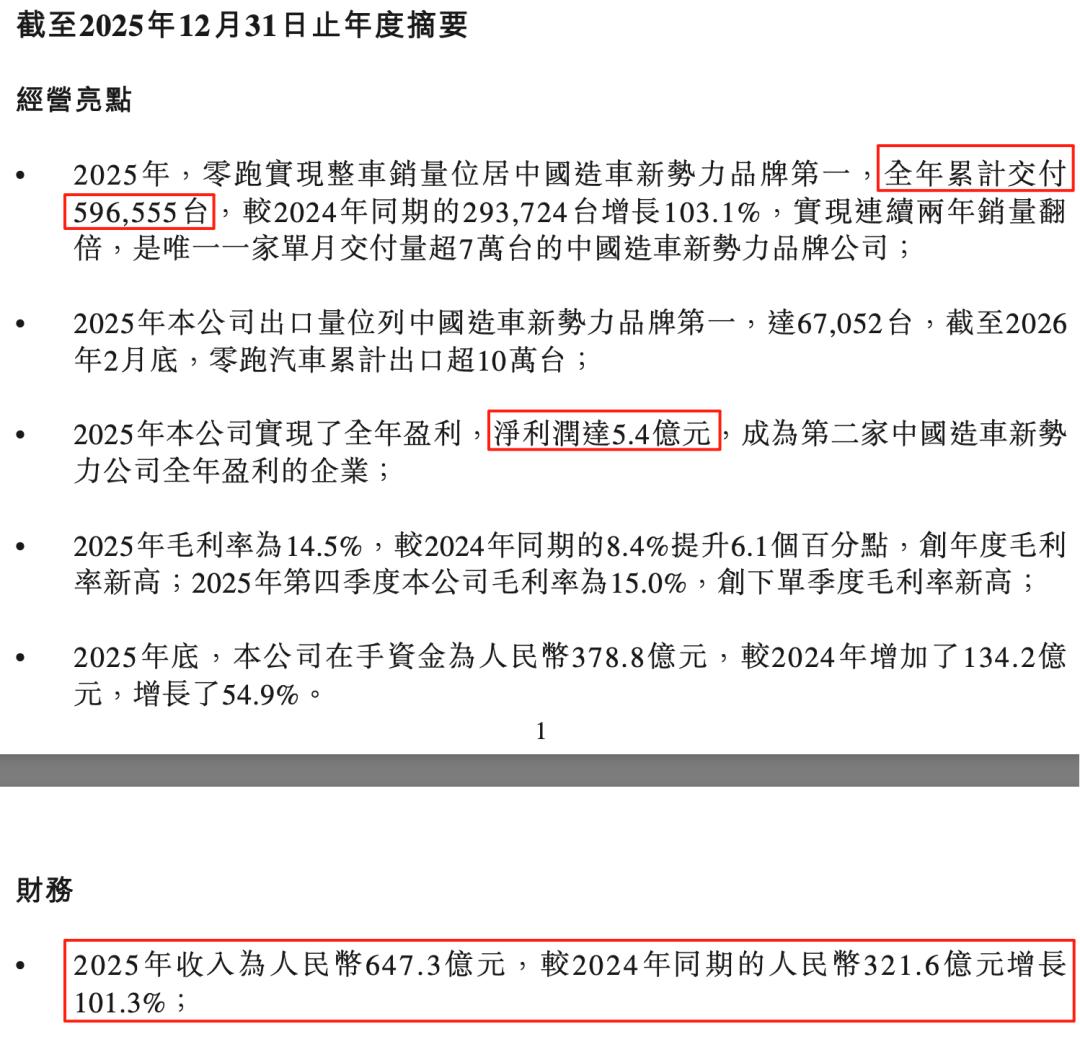 2025年,零跑全年销量59.7万辆,实现营收 647.3 亿元,同比增长 101.3%;净利润首次扭正为 5.4 亿元,完成从亏损到盈利的关键跨越。