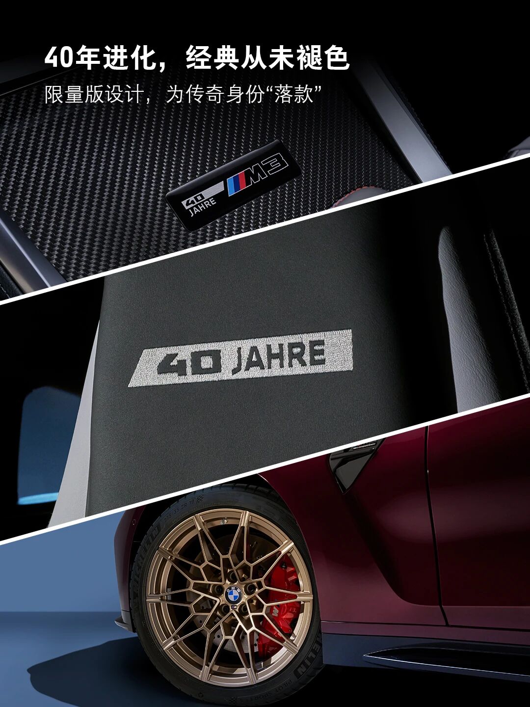 首次引入独有黑色外框双肾进气格栅搭配熏黑车灯组件,车顶、迎宾踏板、前排座椅头枕及中央杯架配有“40 周年限量版”专属徽标,标配 BMW M 碳纤维桶形座椅及带有加热功能的 BMW M 多功能 AIcantara 方向盘。