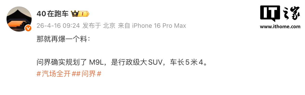 IT之家 4 月 16 日消息,今天(4 月 16 日)上午,博主 @40在跑车 爆料称,鸿蒙智行问界已经规划问界 M9L,新车长度将达 5.4 米,定位为行政级大型 SUV。