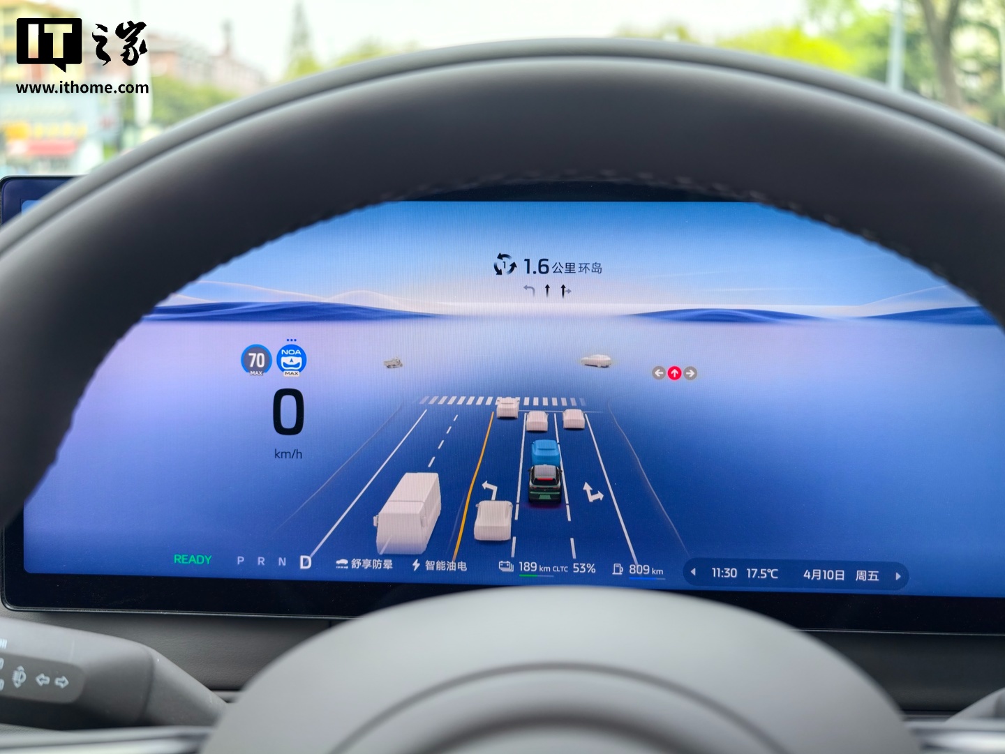 面对突然横穿的非机动车或是无保护路口的复杂博弈,系统的判断逻辑流畅自然,既不急刹也不犹豫。它能够精准识别交通标识。大概 10 公里左右的智驾路程,IT之家全程没有接管,包括环岛通行和路口掉头时,表现得就像一位经验丰富的老司机一样。