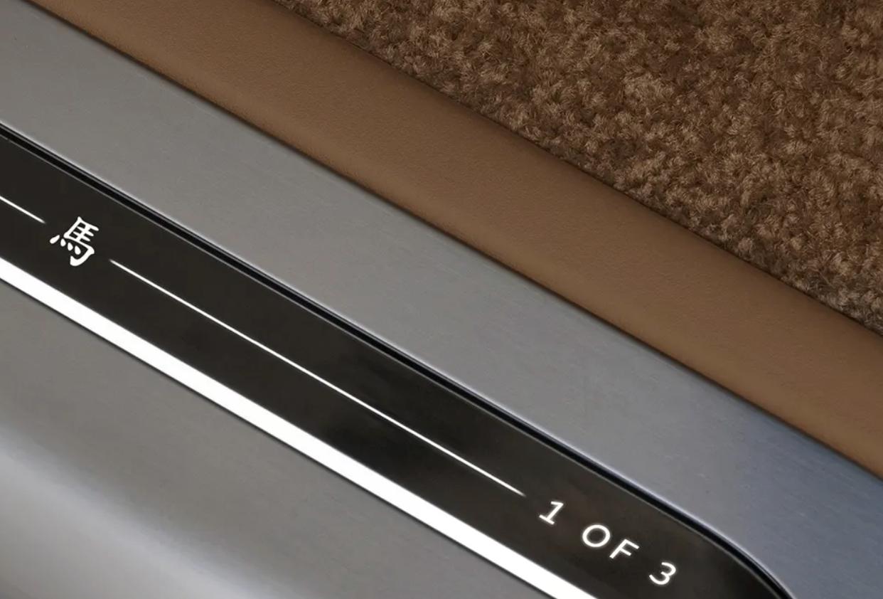 座舱内部以“马年”主题为核心视觉元素。座椅表面点缀精细的马鬓刺绣纹样,琥珀褐与浅米色双拼内饰营造典雅传统豪华氛围。装饰面板融入“马”字纹理元素,限量编号发光踏板进一步强调稀缺属性。