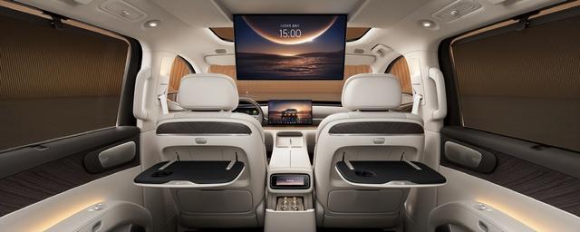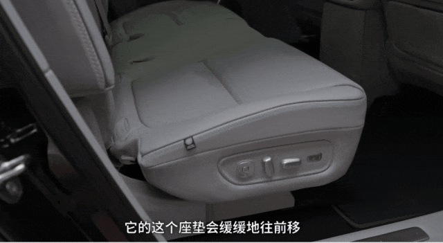 只要拨动后排的放平按钮,那么二排的坐垫会电动的下沉,然后二排再自动折起来,与三排形成一个全平的空间。