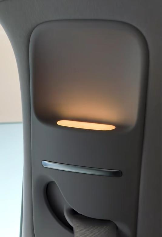 比如这个壁灯,和普通的氛围灯不同,零跑在安全带上方做了这么一个设计,这样一来不用在车顶做一圈灯带,也能有天窗氛围灯的效果。