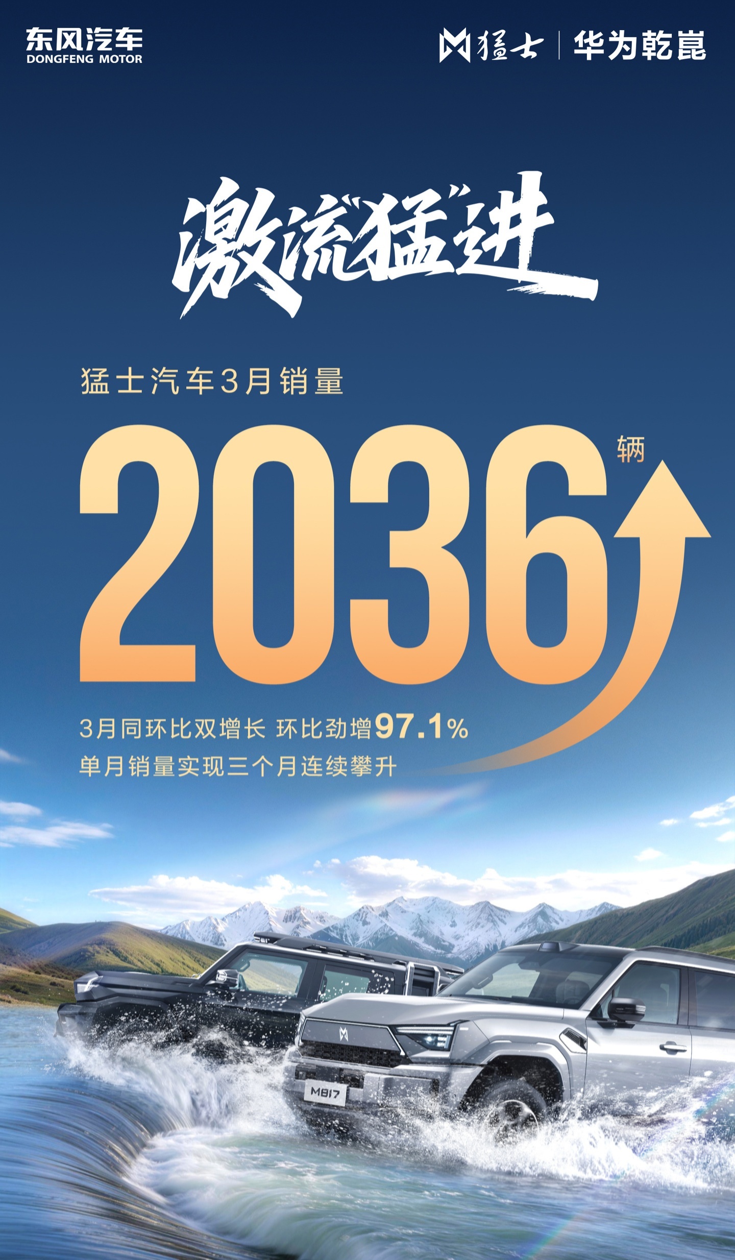 去年 12 月,东风汽车官宣 2025 新能源年销突破 100 万辆,同时猛士 M817 迎万辆里程碑。今年 3 月,猛士汽车官宣销量为 2036 辆,同环比双增长,环比大增 97.1%。此外,猛士汽车实现三个月销量连续攀升。