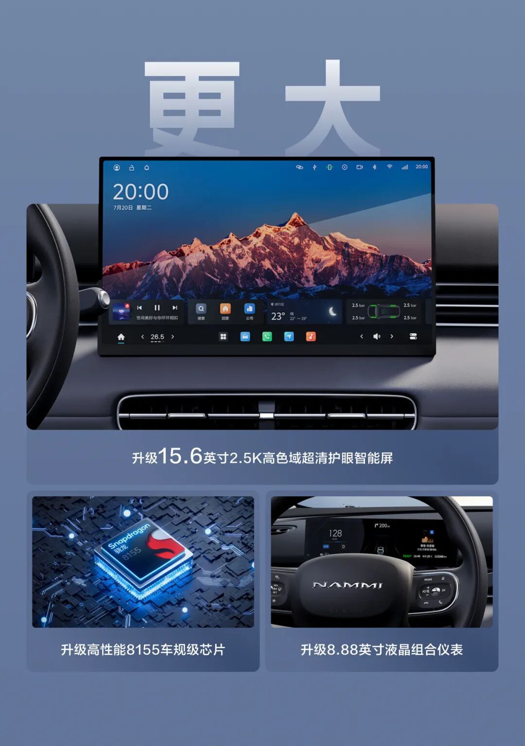 内饰方面,新车搭载 15.6 英寸 2.5K 高色域超清护眼智能屏、8.88 英寸液晶组合仪表,搭载高通 8155 车机芯片,标配 540° 全景鸟瞰功能,支持全场景泊车与循迹倒车等辅助驾驶功能。