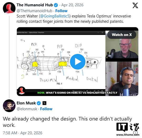 IT之家注意到,马斯克就上周发布的特斯拉 Optimus 人形机器人手部专利进行了回应,他深夜在 X 平台坦率回复一则帖子时透露,“我们已经修改了设计,这个版本实际上根本行不通。”