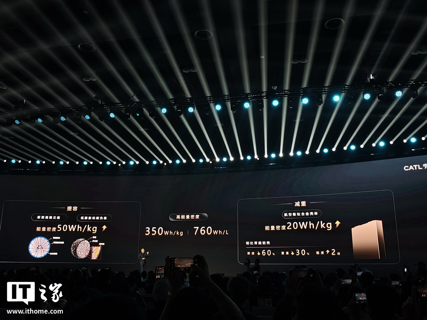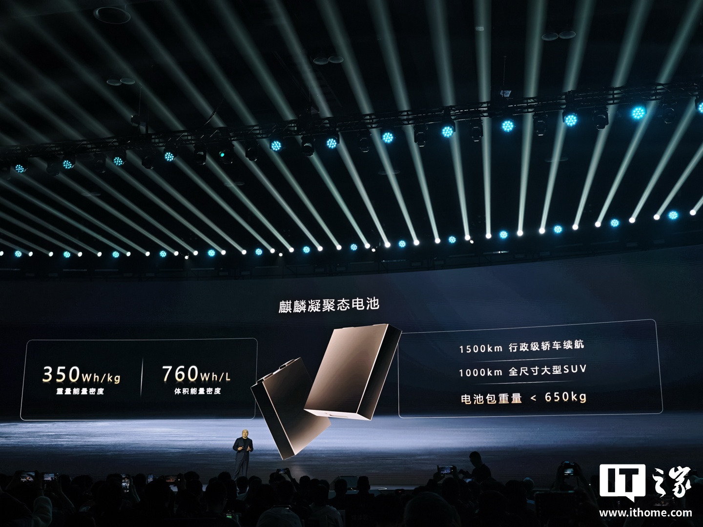 同场发布的麒麟凝聚态电池,具备 350Wh/kg 重量能量密度、760Wh/L 体积能量密度,电池包重量小于 650kg,行政级轿车续航达到 1500km,全尺寸大型 SUV 续航达到 1000km。