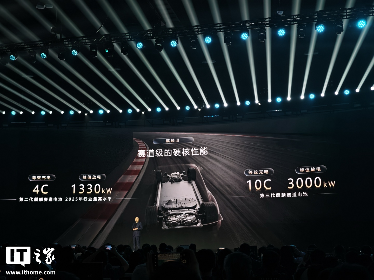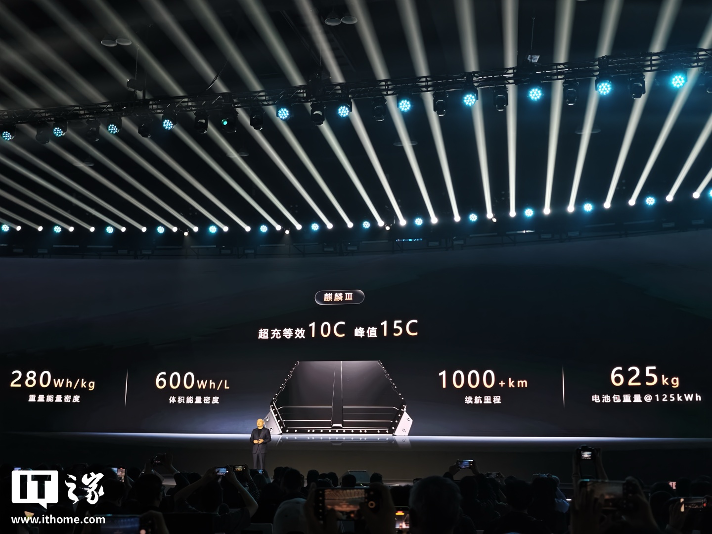 IT之家 4 月 21 日消息,在今天晚间的宁德时代 2026 年超级科技日发布会上,宁德时代正式发布第三代麒麟电池。该电池超充等效 10C、峰值 15C,拥有超过 1000 公里的续航里程、600Wh/L 体积能量密度、280Wh/kg 重量能量密度,125kWh 电池包重量仅有 625kg。
