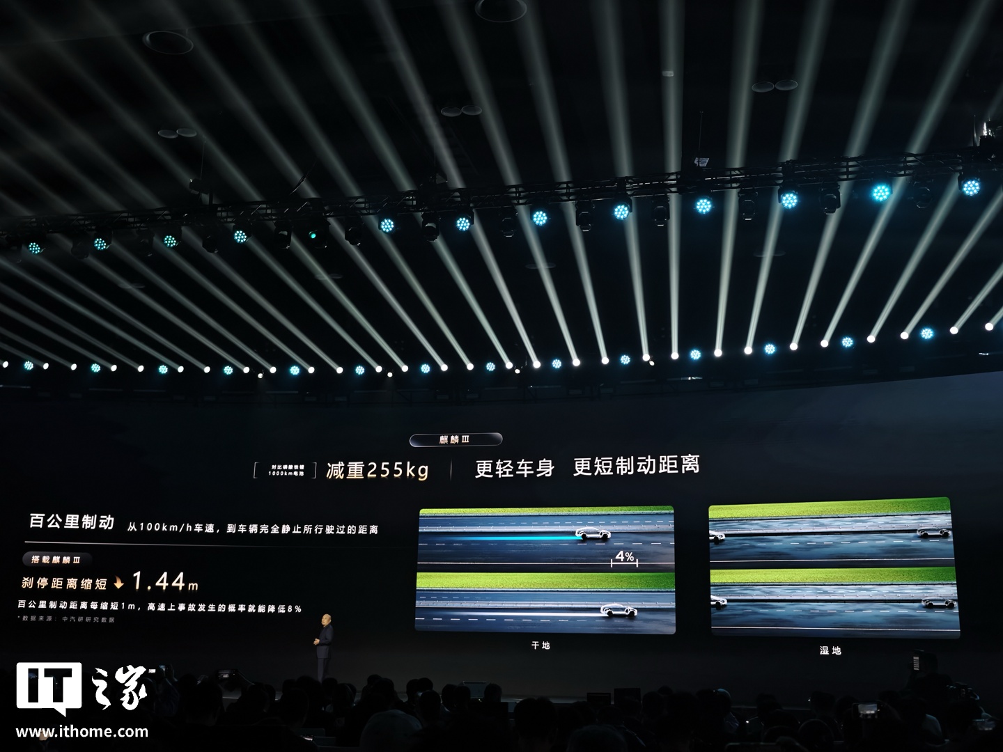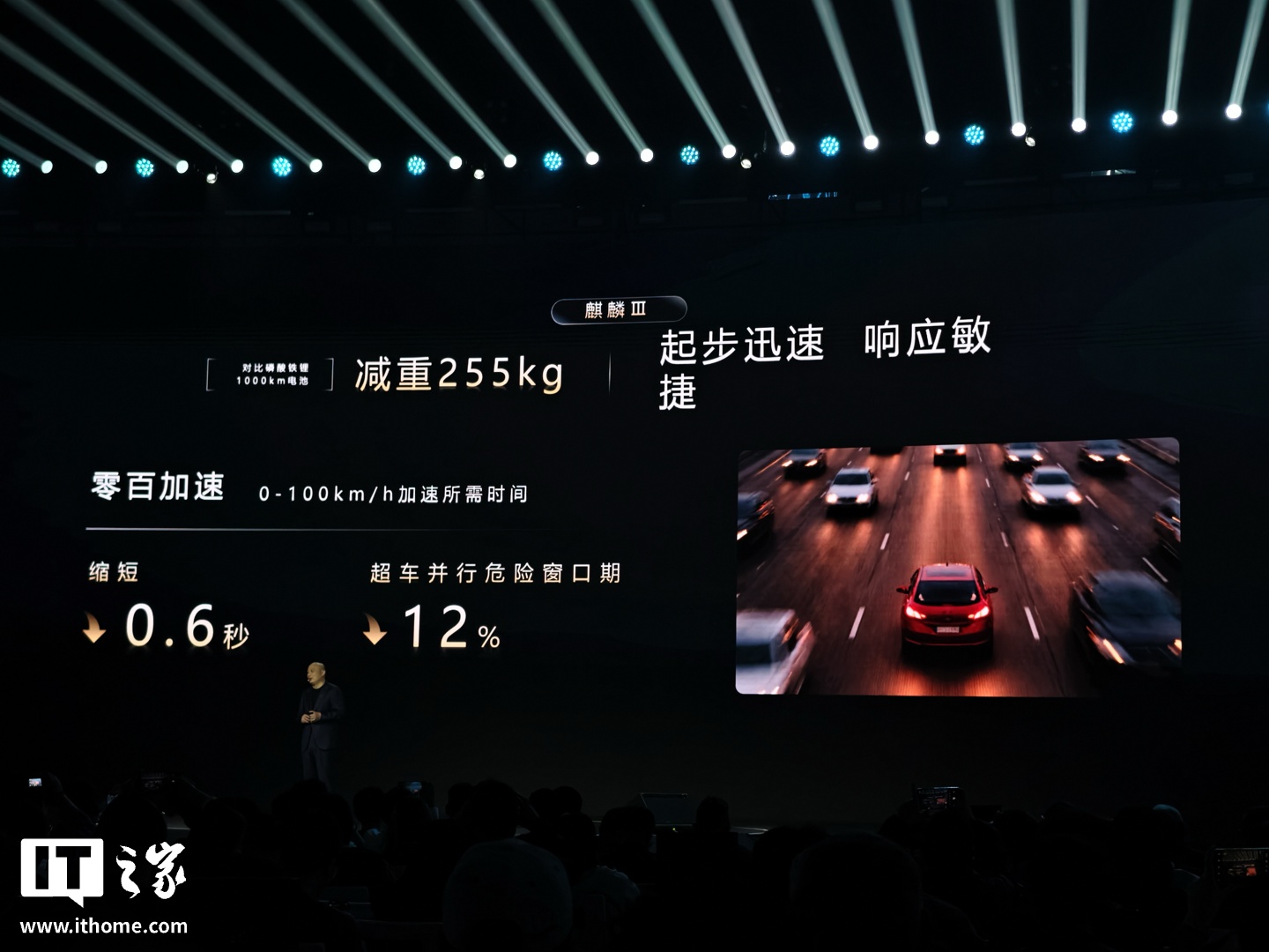 该三元锂电池相比磷酸铁锂电池减重 255kg,号称极致轻量化,搭载该电池的车型将拥有更强操控,加速、避险、制动等方面均有更佳表现:零百加速缩短 0.6 秒、超车并行危险窗口期降低 12%。在麋鹿测试场景中,车速可提升 8%、车身侧倾角降低 6.5%、极限避险能力提升 15-25%。百公里制动方面,搭载第三代麒麟电池的车型刹停距离缩短 1.44m。