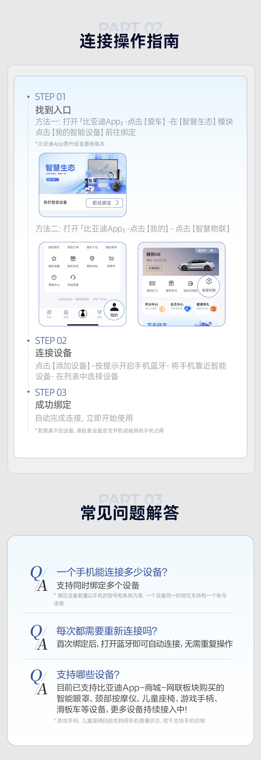 官方表示,该功能目前已支持比亚迪 App — 商城 — 网联板块购买的智能眼罩、颈部按摩仪、儿童座椅、游戏手柄、滑板车等设备,更多设备持续接入中。