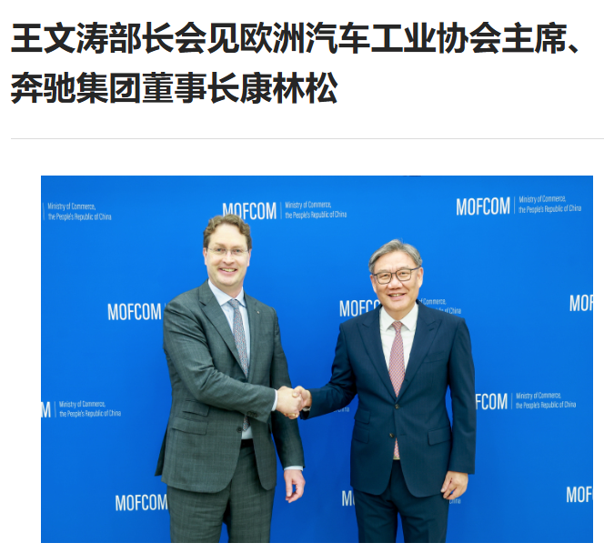 IT之家 4 月 24 日消息,4 月 23 日,商务部部长王文涛会见欧洲汽车工业协会主席、奔驰集团董事长康林松,双方就中欧汽车产业合作、欧盟对华经贸限制措施等问题进行交流。