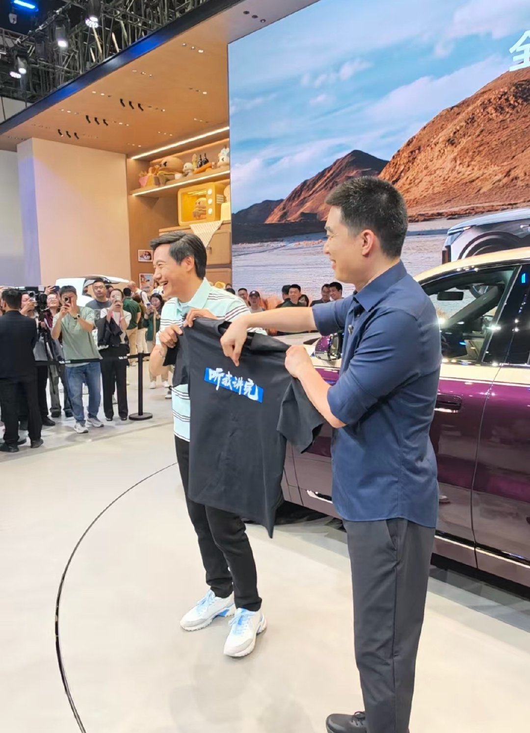 凤凰网科技讯 4月24日,在北京车展现场,雷军送给李想一件“听我讲完”T恤。李想则笑着对雷军说:“谢谢。”