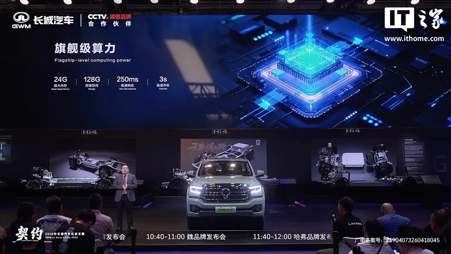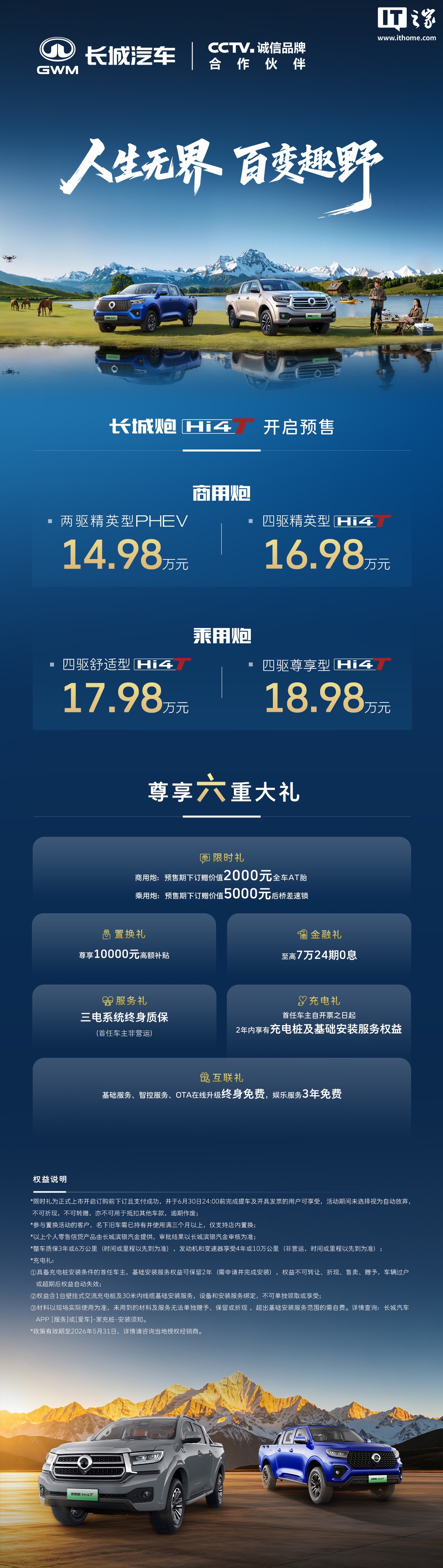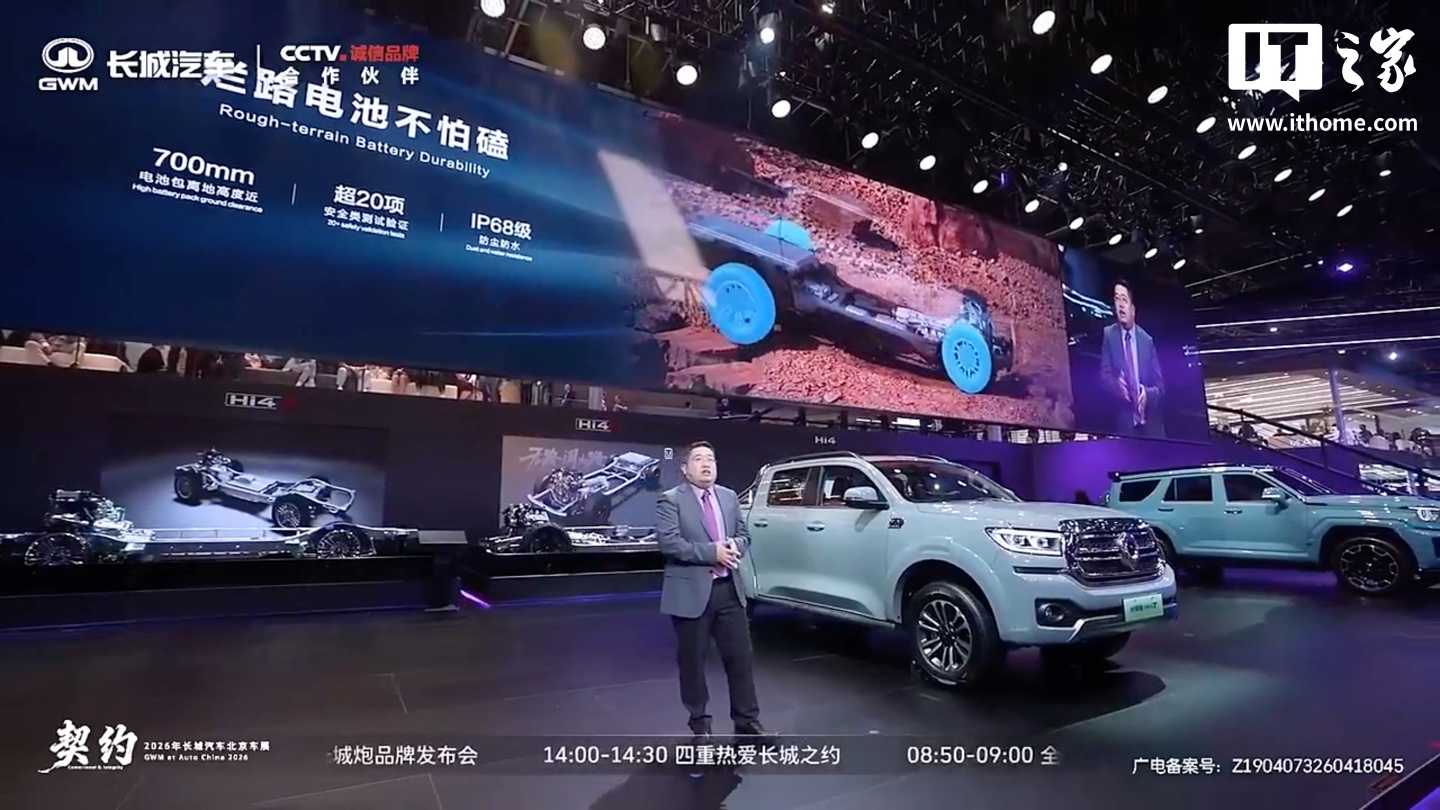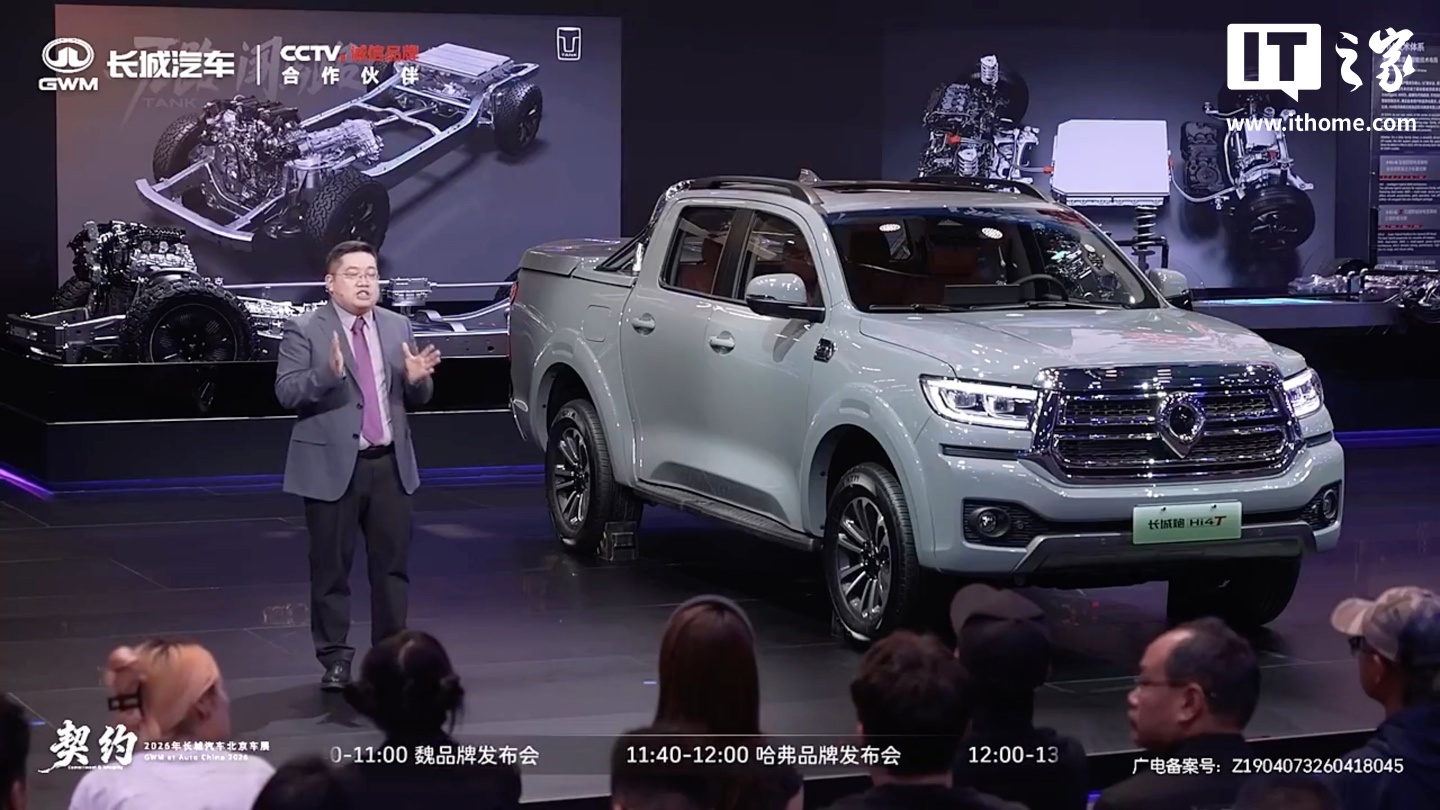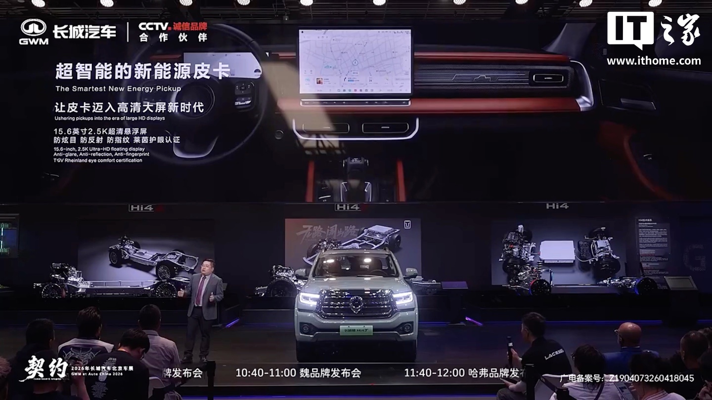 IT之家 4 月 24 日消息,在 2026 北京车展上,长城炮 Hi4-T 皮卡正式发布,预售价 14.98 万元起: