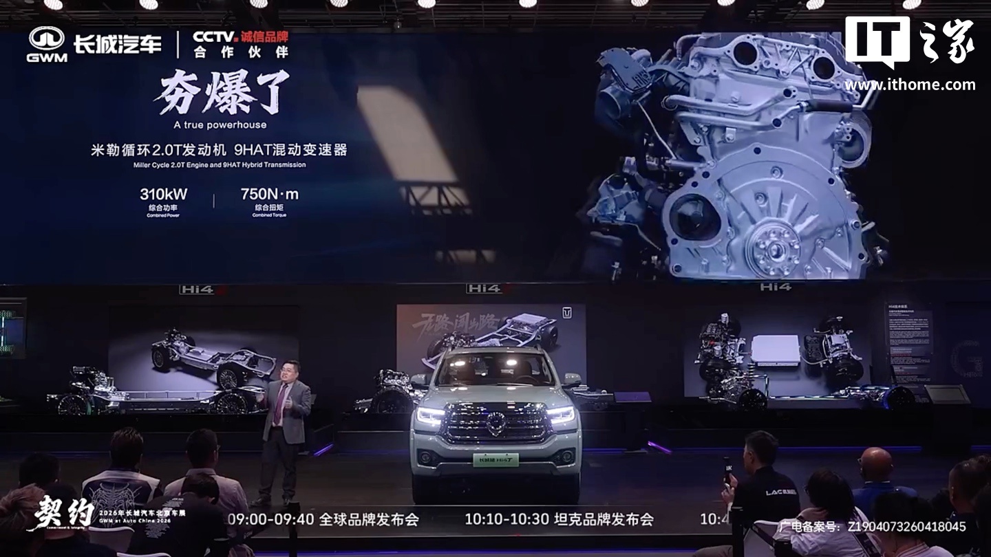 长城炮 Hi4-T 皮卡搭载米勒循环 2.0T 发动机、9HAT 混动变速器,综合功率 310kW、综合扭矩 750N·m;搭载 33.1kW·h 大容量电池,WLTC 综合续航 947km、NEDC 综合续航 1081km。