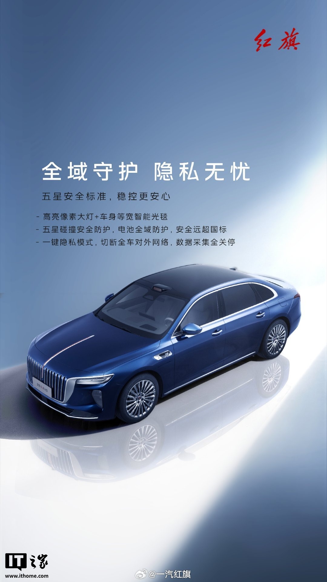 全新一代红旗 H9 还配备高亮像素大灯 + 车身等宽智能光毯,支持五星碰撞安全防护、电池全域防护、一键隐私模式(可切断全车对外网络,数据采集全关停)。