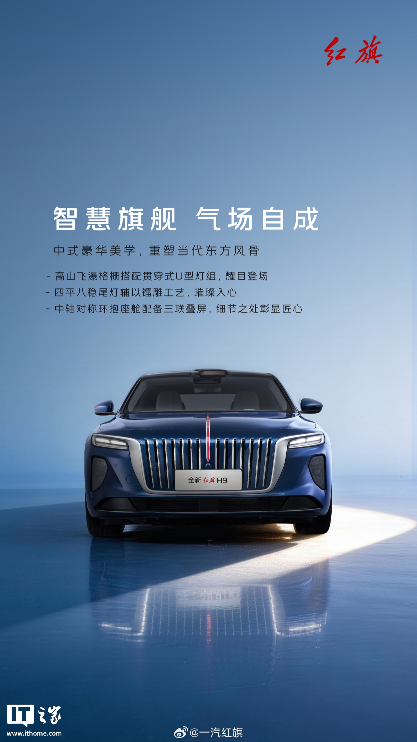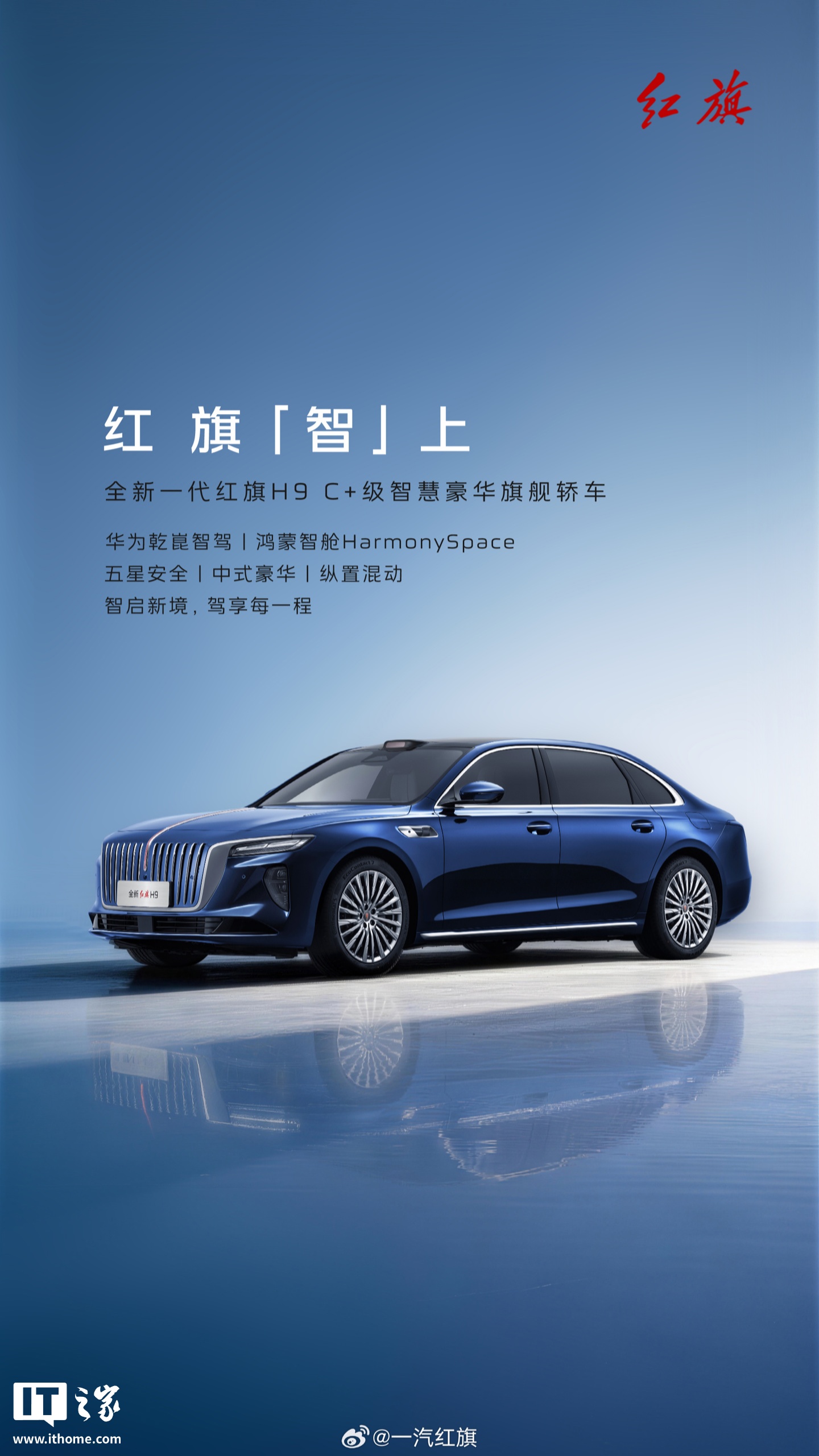 IT之家 4 月 26 日消息,一汽红旗官方今日开启了对全新一代红旗 H9 的预热。新车定位 C+ 级智慧豪华旗舰轿车,主打五星安全、中式豪华、纵置混动等。