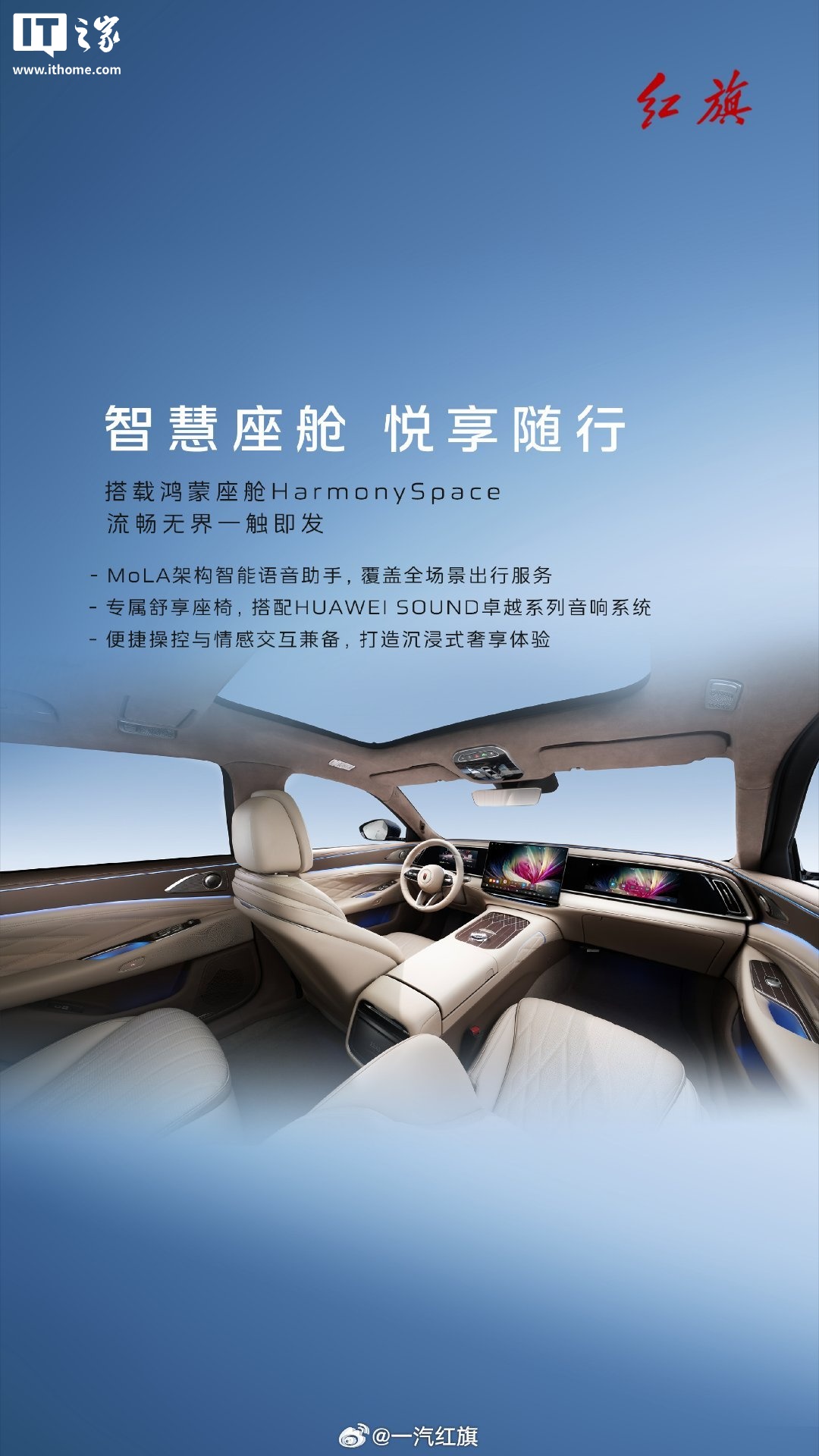 新车的鸿蒙座舱 HarmonySpace 将支持 MoLA 架构智能语音助手,同时车内还搭载了专属舒享座椅、HUAWEI SOUND 卓越系列音响系统。