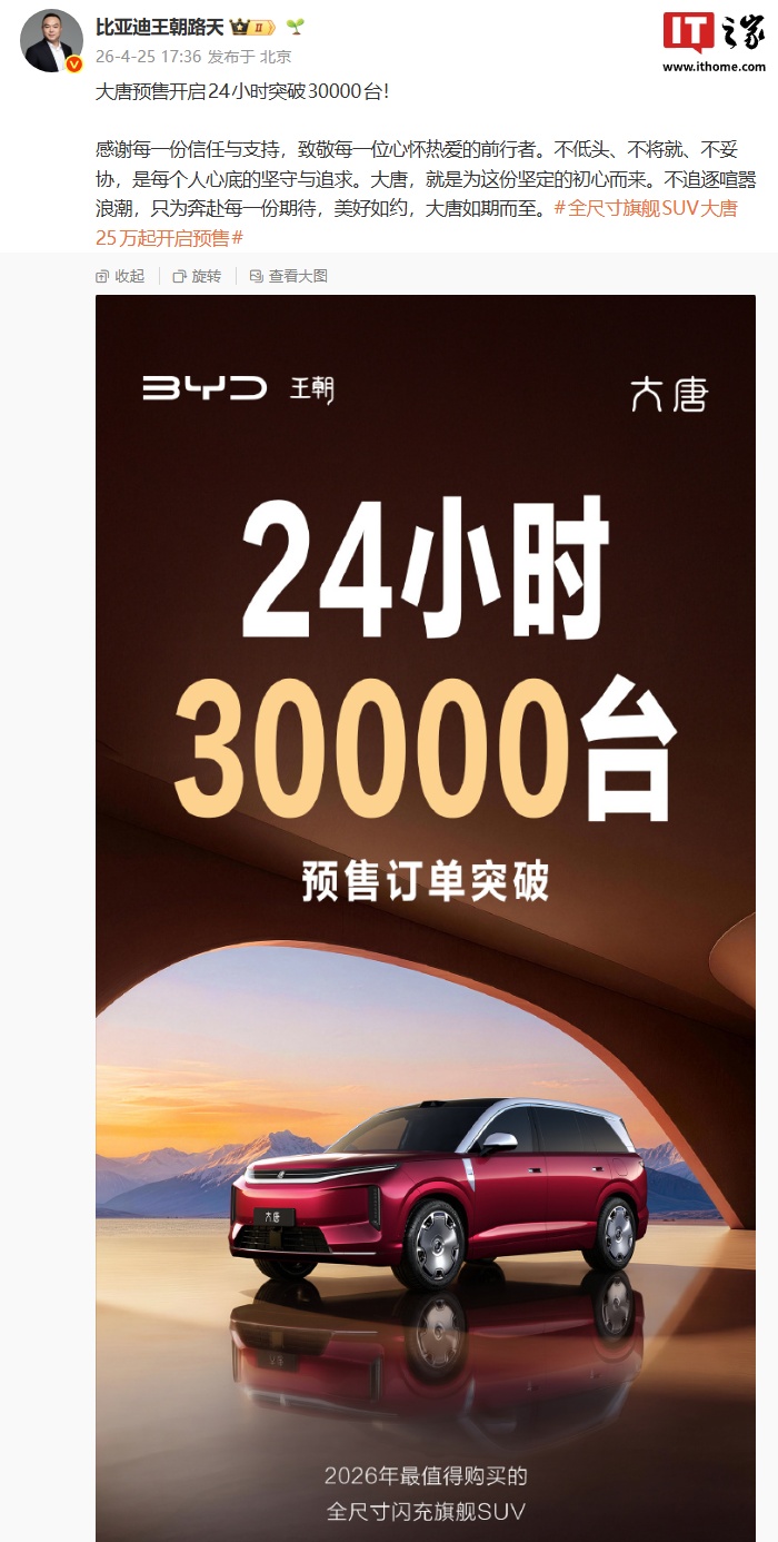 IT之家 4 月 26 日消息,比亚迪王朝网销售事业部总经理路天昨晚宣布,比亚迪大唐预售开启 24 小时突破 30000 台。