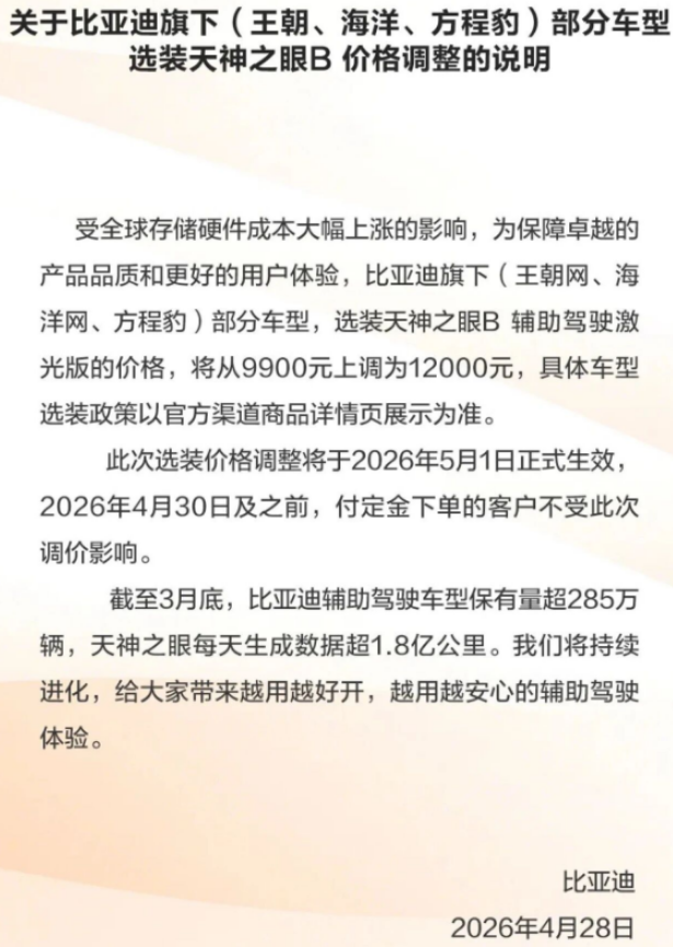 4月28日,市场流传一份《关于比亚迪旗下(王朝、海洋、方程豹)部分车型选装天神之眼B价格调整的说明》。根据该说明,比亚迪旗下王朝网、海洋网、方程豹部分车型选装天神之眼B辅助驾驶激光版的价格,将从9900元上调至12000元,涨幅为2100元。