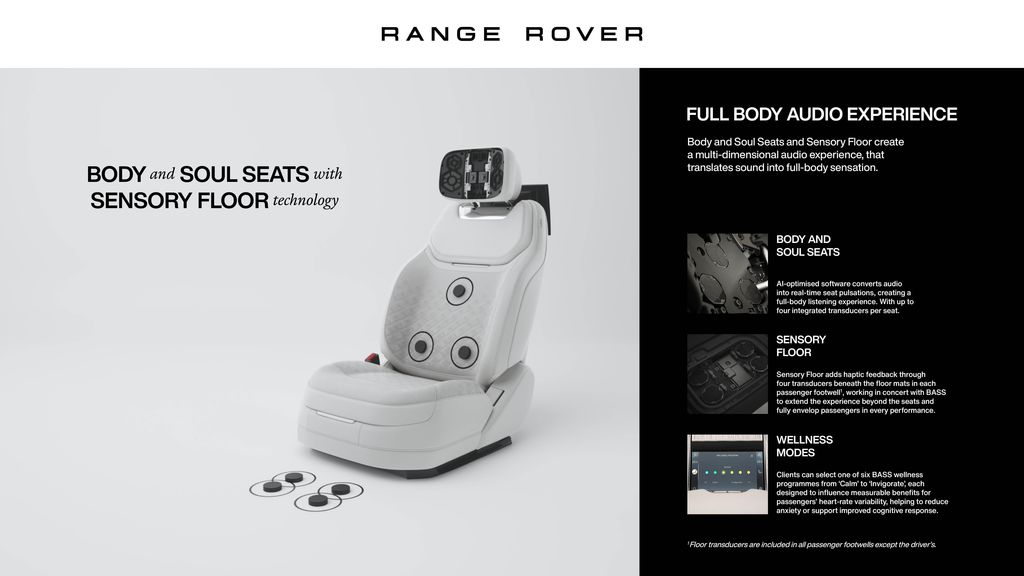 此外,音响系统集成于头枕与椅背,配合 AI 驱动的“身心感应座椅”,可将声音转化为物理振动,让乘员沉浸于音乐之中。