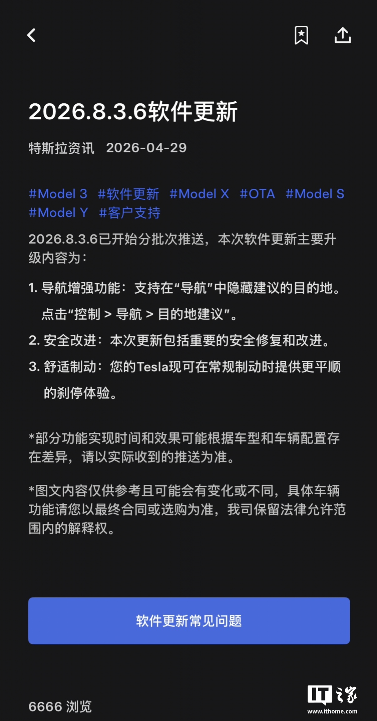 IT之家 4 月 29 日消息,特斯拉中国今日宣布推送 2026.8.3.6 版本的车机软件更新。