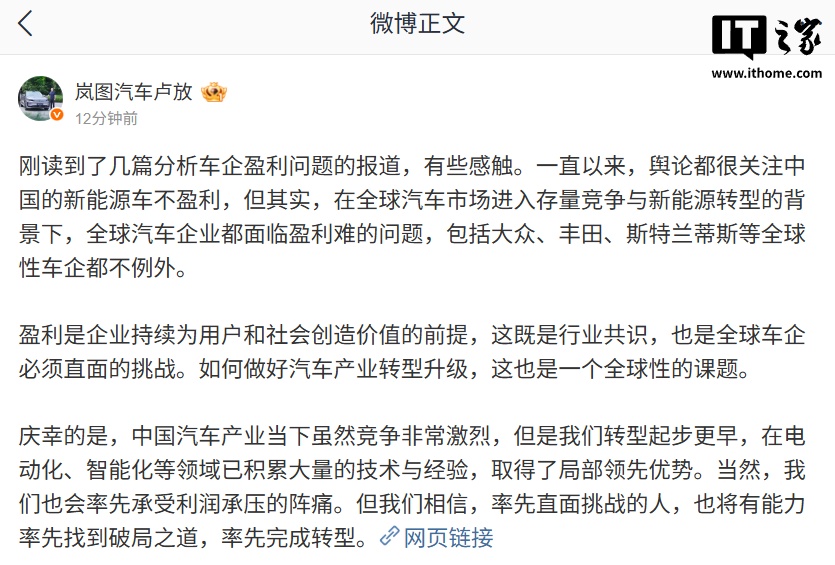 IT之家 4 月 29 日消息,岚图汽车科技股份有限公司董事长卢放今日发文称,刚读到了几篇分析车企盈利问题的报道,有些感触。一直以来,舆论都很关注中国的新能源车不盈利,但其实,在全球汽车市场进入存量竞争与新能源转型的背景下,全球汽车企业都面临盈利难的问题,包括大众、丰田、斯特兰蒂斯等全球性车企都不例外。
