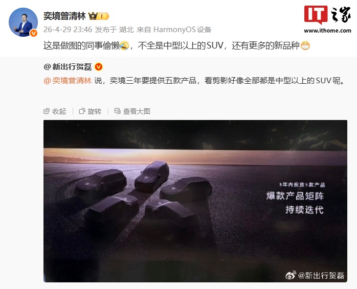IT之家 4 月 30 日消息,2026 北京车展期间,华为乾崑 | 奕境 X9 大六座 SUV 面向全球进行展出。奕境汽车品牌总经理曾清林提到,公司计划未来两到三年,推出近 5 款产品,基本按照每年两到三款产品的进度推进。