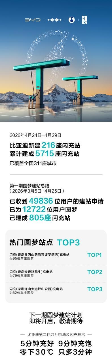 目前,比亚迪已全面推动“闪充中国”战略落地,加快在全国范围布局高密度闪充网络。IT之家从数据中获悉,截至 4 月 29 日,比亚迪已累计建成 5715 座闪充站,覆盖全国 311 座城市,预计到今年年底建设落成 20000 座闪充站,号称“让闪充真正遍布全中国”。