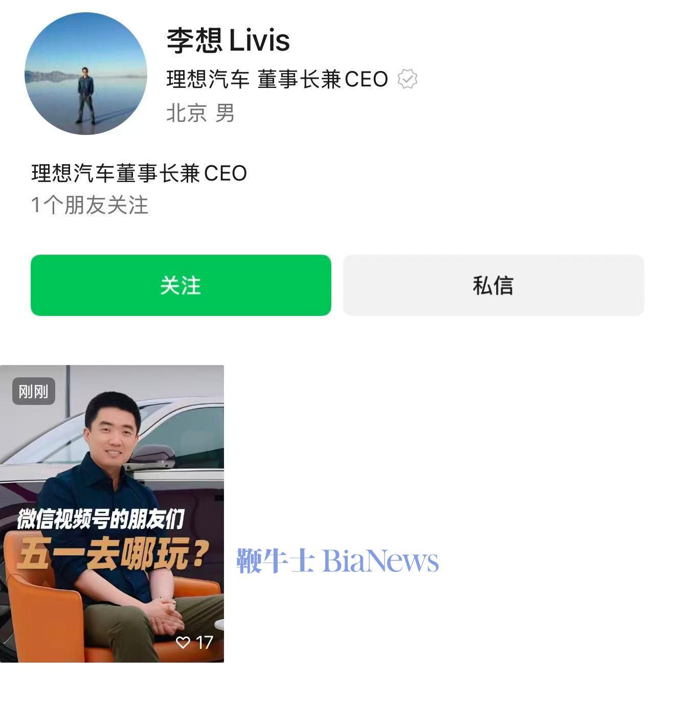 凤凰网科技讯 (作者/许婧)4月30日,理想汽车创始人、董事长兼CEO李想正式开通视频号,并发布了第一条视频作品。他在视频中表示,未来将在此持续分享关于汽车与具身智能的深度思考和判断。