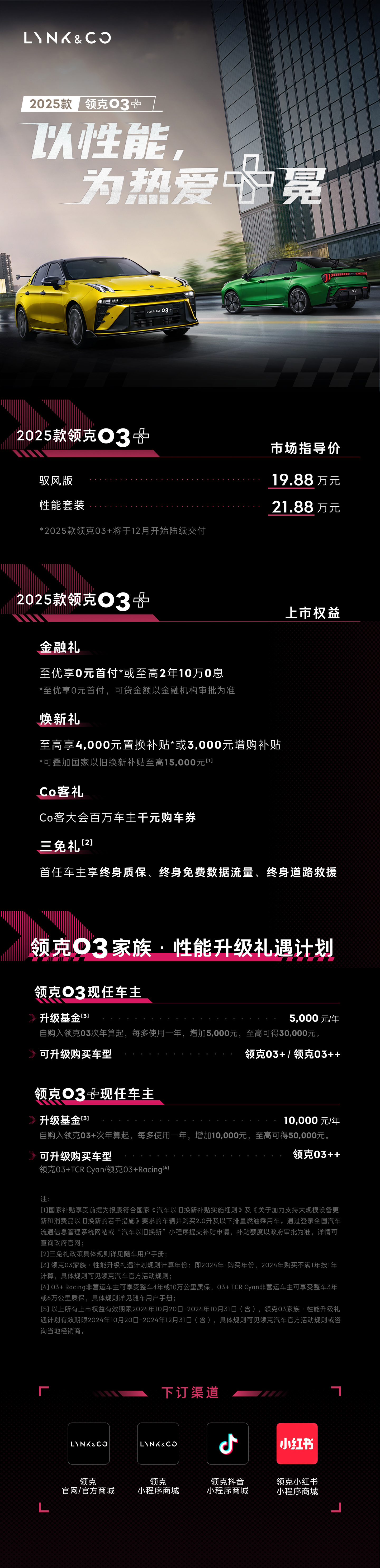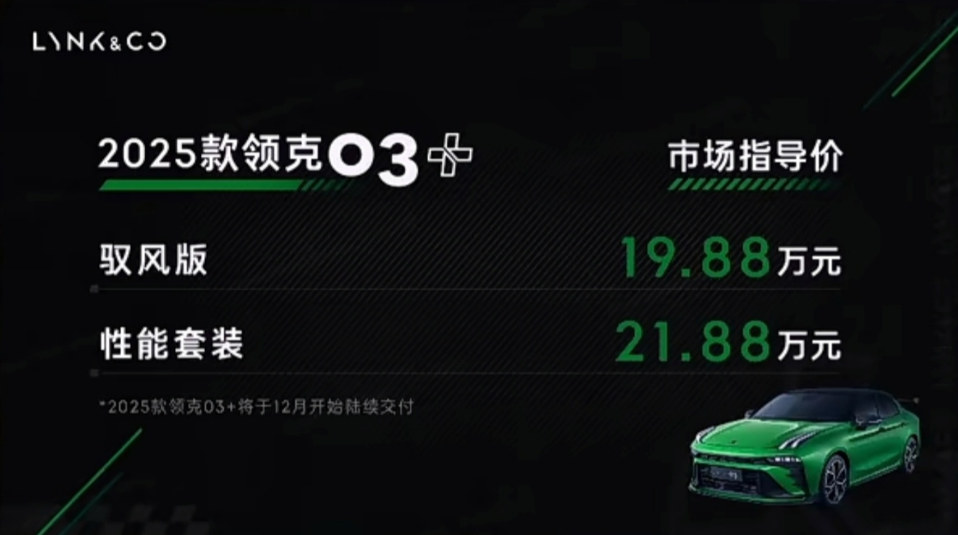 IT之家 10 月 20 日消息,在今晚的发布会上,2025 款领克 03+ 上市,驭风版售价为 19.88 万元,性能套装版价格为 21.88 万元,将于 12 月开始陆续交付。