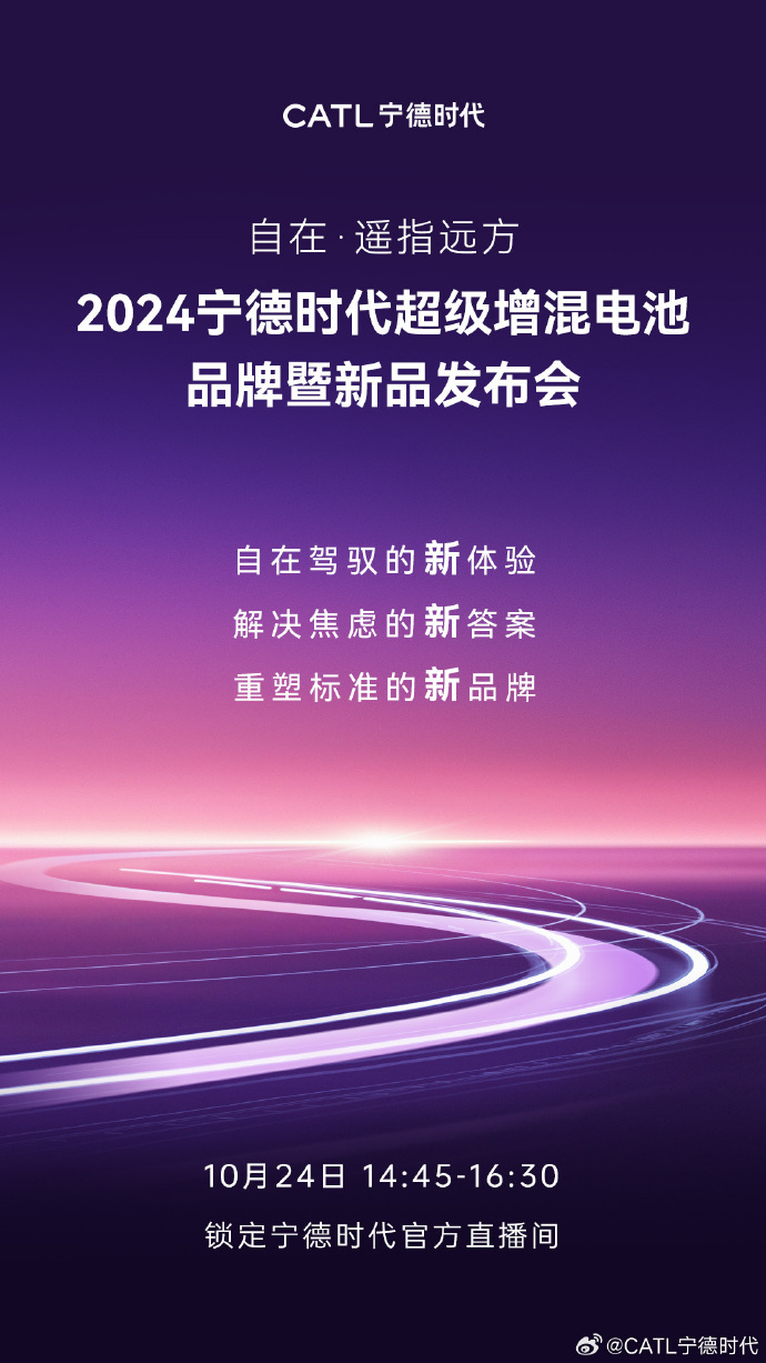 IT之家 10 月 20 日消息,宁德时代今日宣布,2024 宁德时代超级增混电池品牌暨新品发布会将于 10 月 24 日举行,具体时间为 14:45-16:30。海报打出了“自在驾驭的新体验、解决焦虑的新答案、重塑标准的新品牌”的标语。