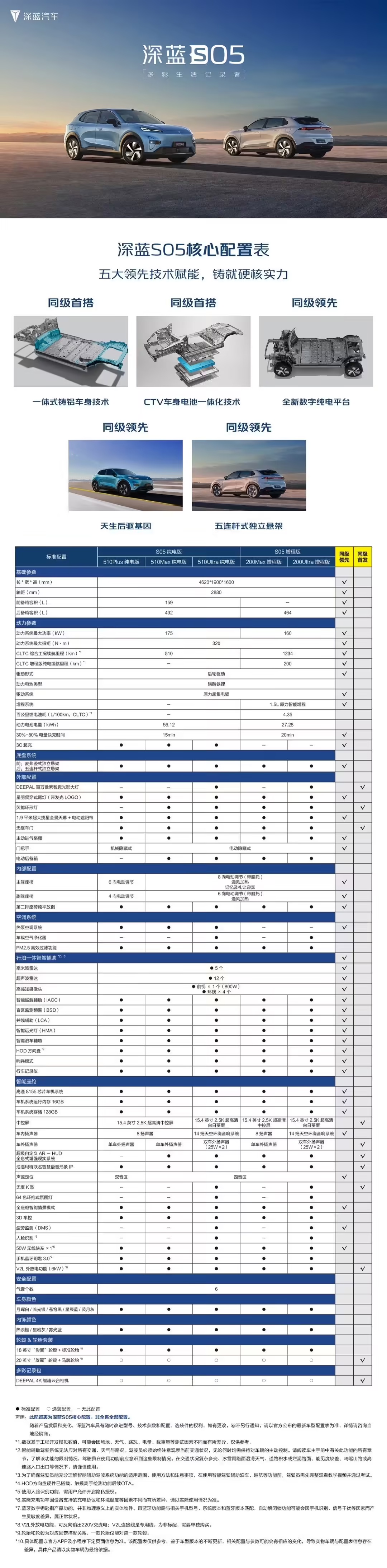 深蓝 S05 提供纯电动和增程式动力两种版本,其中增程款有着 4.35L / 100km 的馈电油耗,200km 的纯电续航里程(CLTC)以及 1234km 的综合续航里程(CLTC);纯电款搭载了配备宁德时代电芯的“金钟罩电池”,续航里程 510km(CLTC),支持 3C 快充、6kW 外放电功率。两种动力方式的车型峰值扭矩均为 320N・m。