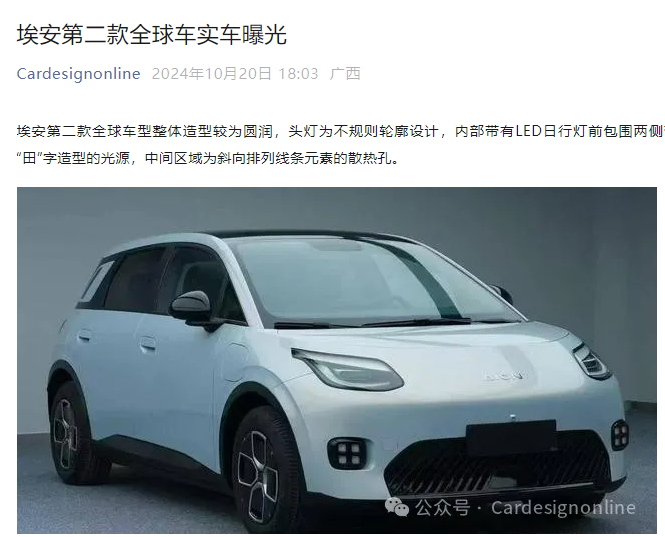IT之家 10 月 20 日消息,据 Cardesignonline 公众号,广汽埃安第二款全球车实车曝光,该车整体造型较为圆润,头灯为不规则轮廓设计。