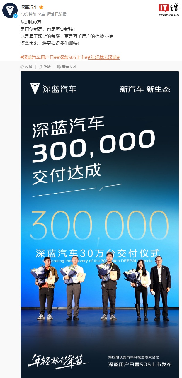 IT之家 10 月 20 日消息,在今日举行的长安深蓝 S05 上市发布会上,深蓝汽车举行了第 30 万台新车的交付仪式。