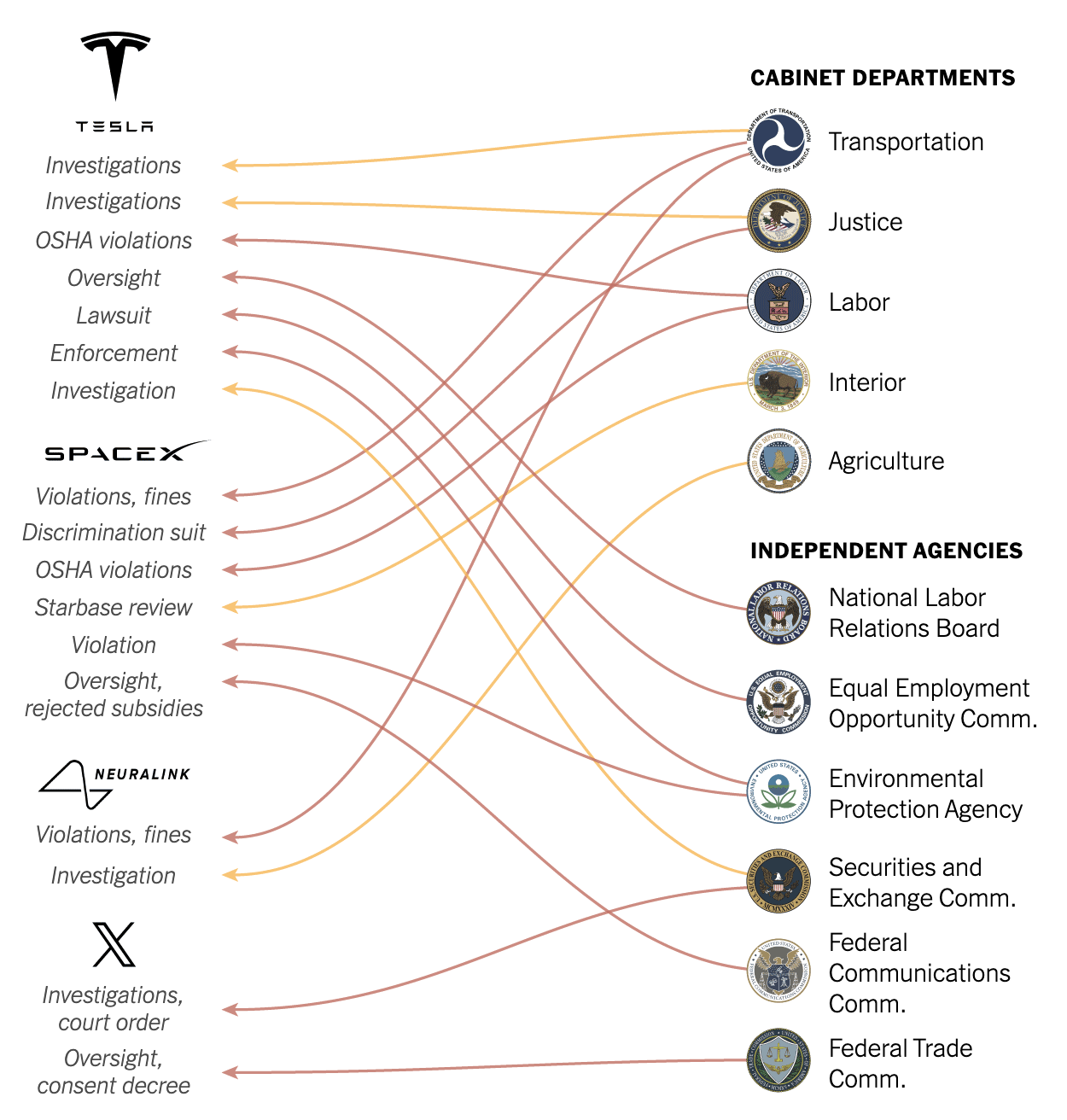 《纽约时报》通过查阅法庭文件、监管档案和政府合同数据,汇总了马斯克与美国联邦政府在多个领域达成的商业协议,以及联邦机构对其公司做出的违规、罚款、和解协议及其他调查的情况。这些资料共同展示了一个错综复杂的关系网络:马斯克并非以中立观察者的身份来担任特朗普提议的新职位,而是将对自己的客户和监管机构作出评判。