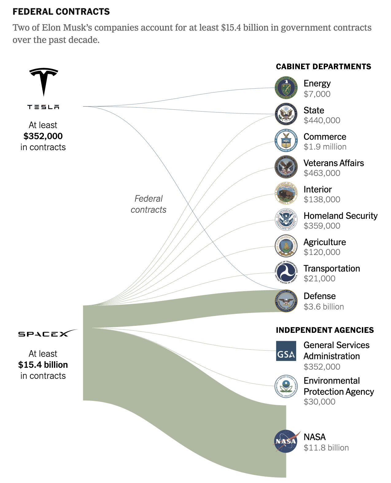 联邦合同数据显示,马斯克为美国政府提供的服务规模庞大:SpaceX被美国政府聘请来为宇航员设计、建造和测试太空着陆系统;SpaceX将其星链卫星互联网服务出售给美国驻土库曼斯坦阿什哈巴德大使馆,为美国官员提供互联网接入服务;特斯拉为美国驻冰岛大使馆提供了一辆战术车辆(用于军事或执法行动);美国林业局使用星链联系在加州偏远地区与山火作斗争的紧急救援人员。