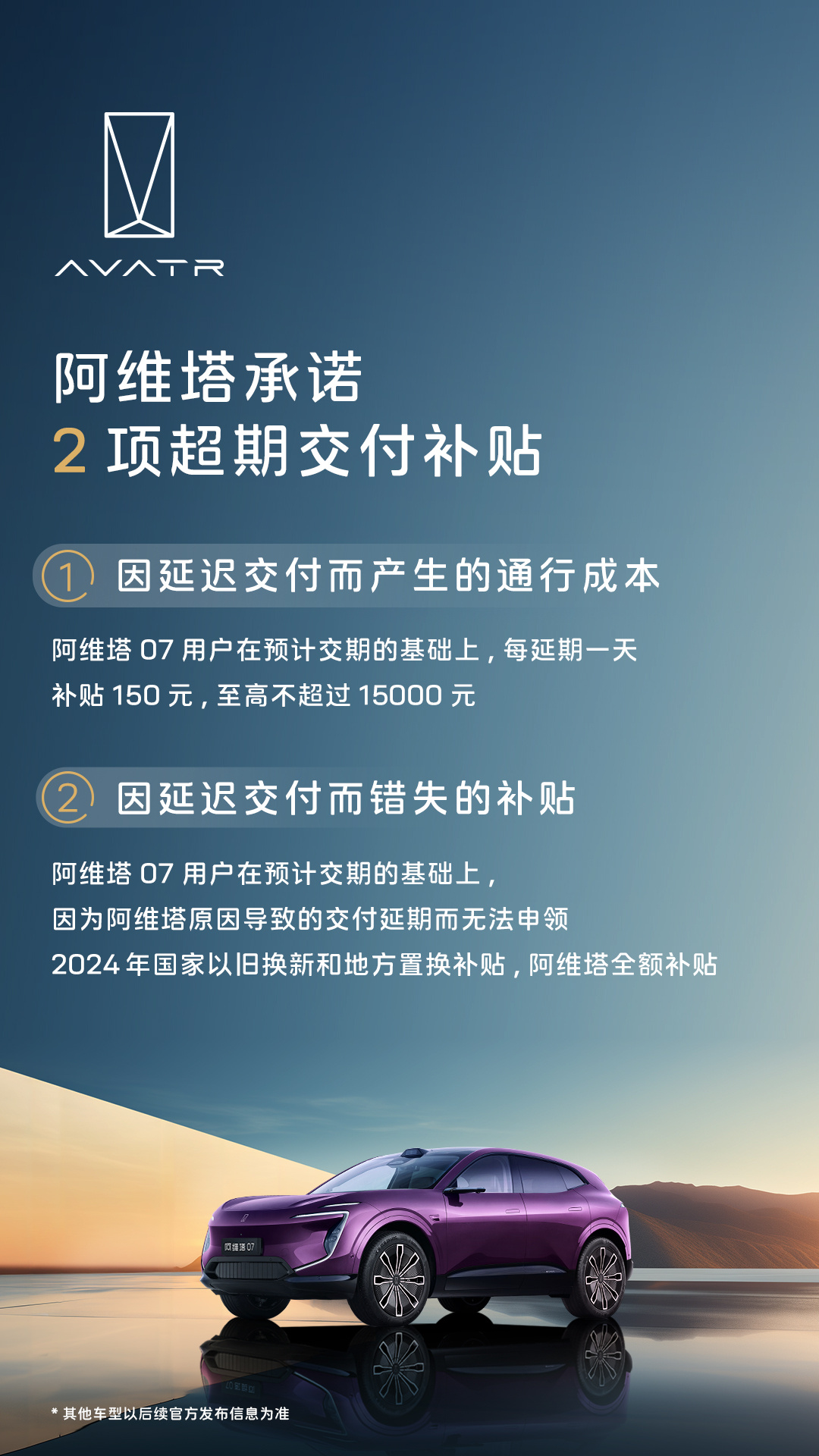 此外,阿维塔 07 用户在预计交期的基础上,每延期一天补贴 150 元,至高不超过 15000 元。