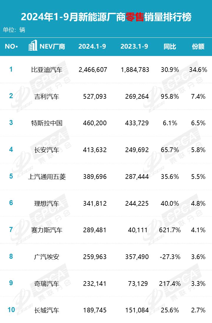 乘联会数据显示,2024年前三季度,除了比亚迪的246万的零售销量均为新能源车贡献,吉利汽车、长安汽车的零售销量中也有40%以上为新能源车贡献。