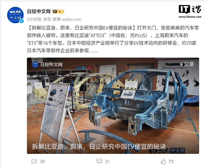 IT之家 10 月 21 日消息,据日经今日报道,日本中部经济产业局 10 月 7 日举行了分享纯电动汽车技术动向的研修会,日本中部地区约 70 家汽车零部件企业访问了电动汽车的拆解展示设施,并学习中国产电动汽车的车身结构和零部件设计特点。