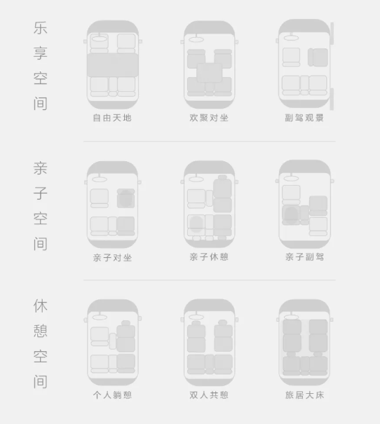 在亲子休憩模式下,右后座椅靠背可以无级调节,副驾驶座椅可旋转 180 度;在亲子副驾模式下,可实现副驾座椅后移、左后座椅前移;在个人躺憩模式下,副驾驶座椅可旋转 180 度;在双人共憩模式下,前排座椅可旋转 180 度;在旅居大床模式下,前排座椅放平,铺上床垫可变大床。