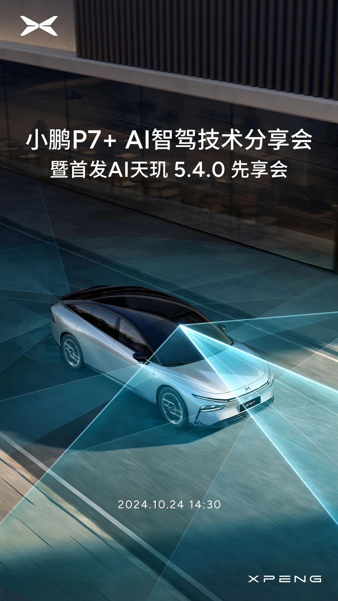 IT之家 10 月 21 日消息,小鹏 P7+ AI 智驾技术分享会暨首发 AI 天玑 5.4.0 先享会将于 10 月 24 日 14:30 举行,该车预售价 20.98 万元起,将于 11 月上旬上市交付。