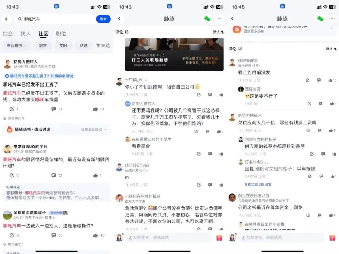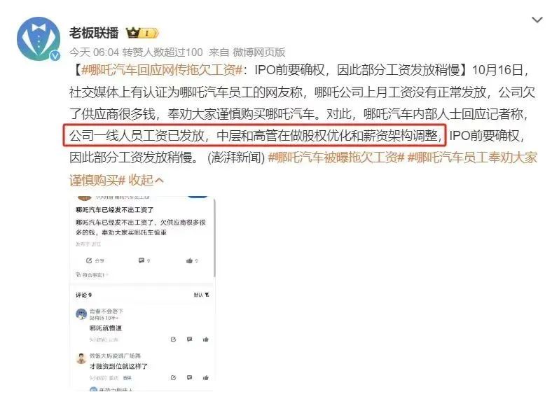 最近,某社交平台上出现大量自称哪吒员工的爆料,称哪吒汽车停发了工资,一时引发热议。哪吒汽车很快回应,否认“工资停发”,给出的解释则把话题引向了IPO。