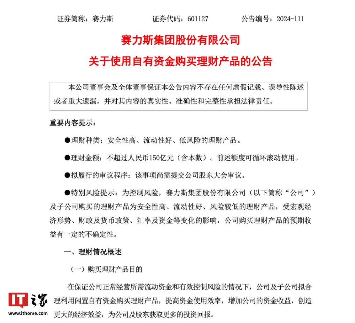 IT之家 10 月 21 日消息,赛力斯集团股份有限公司今日发布公告,公司及子公司拟使用不超过 150 亿元(含本数)的自有资金进行理财,前述额度可循环滚动使用。
