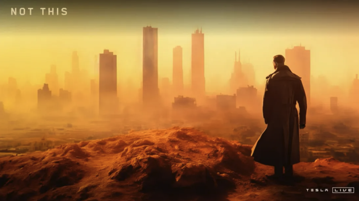 本月早些时候,特斯拉举行“我们,机器人”发布会上,推出了期待已久的自动驾驶出租车Cybercab,该车型没有配备方向盘和加速踏板等控制装置。这场发布会使用了受《银翼杀手2049》启发的图像,该电影中也出现了无人驾驶车辆。演示过程中包含了一张AI生成的图片,与《银翼杀手2049》电影中的一个镜头非常相似。在那个镜头中,瑞恩·高斯林(Ryan Gosling)饰演的角色凝视着末日般的世界。